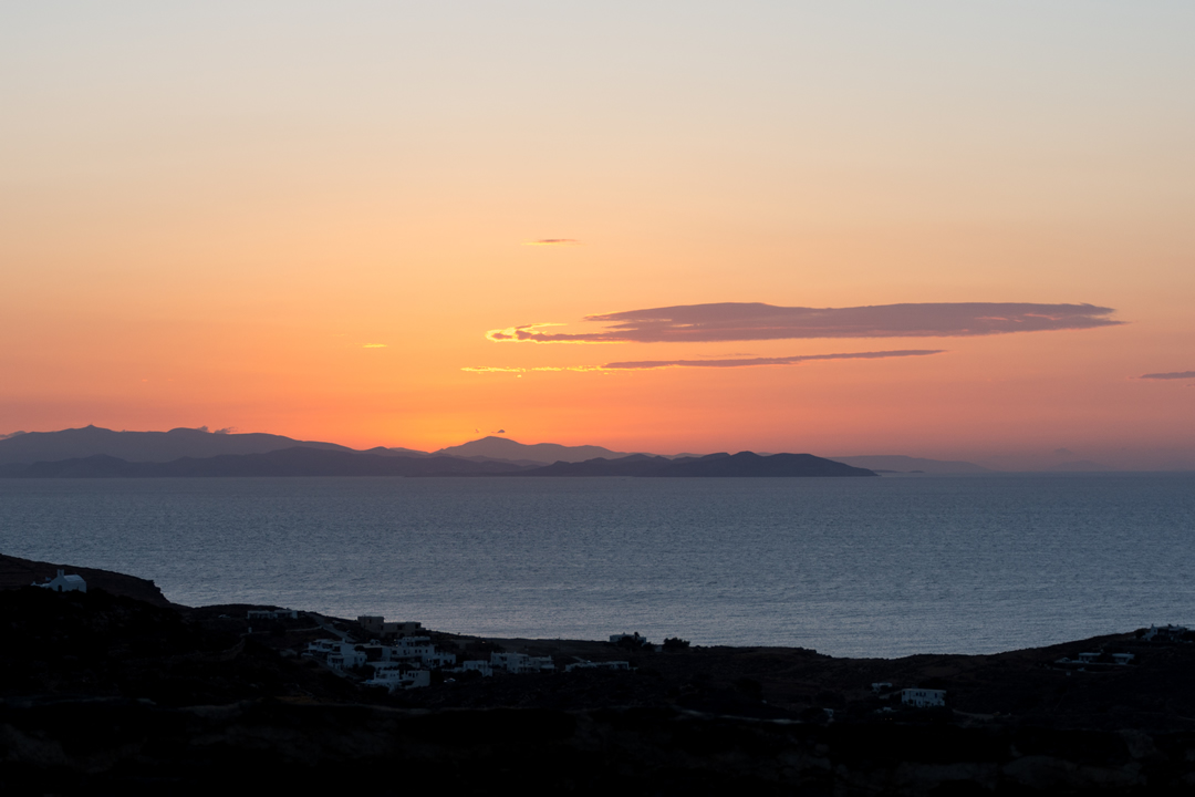 Looking east from Sifnos at dawn. Stroggilo, Despotiko, Antiparos & Paros.